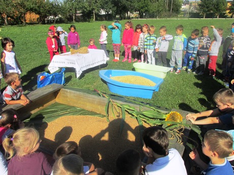 Pod takýmto názvom sa niesla praktická aktivita, ktorú sme mali v stredu (16.9) v našej materskej škole. Deti poznávali rôzne obilniny, vyskúšali si tlčením v mažiari vyrobiť múku, dozvedeli sa ako sa vyrába chlieb a čo všetko je k tomu potrebné. Poznávali klasy, na ktorých rastie kukurica, slnečnica, ovos, pšenica, jačmeň, mak a rasca. Dozvedeli sa, že vyrobiť jeden chlieb nie je vôbec jednoduché, a kým sa dostane chlieb k nám na stôl musí prejsť dlhú cestu od semienka až k chlebíku.
